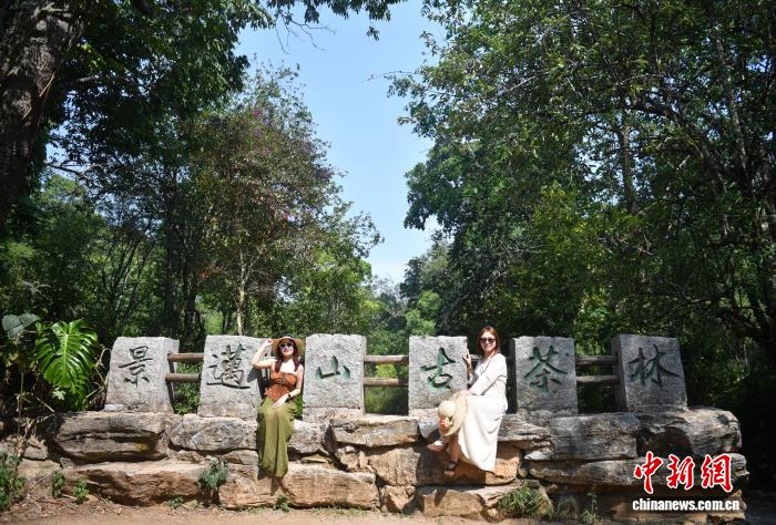 4月14日,游客打卡景迈山。近日,地处中缅边境云南省普洱市澜沧拉祜族自治县的景迈山千年万亩古茶园进入采收季,吸引游人前来买茶、观光。2023年9月17日,“普洱景迈山古茶林文化景观”成为全球首个茶主题世界文化遗产。中新社记者 黄兴鸿 摄