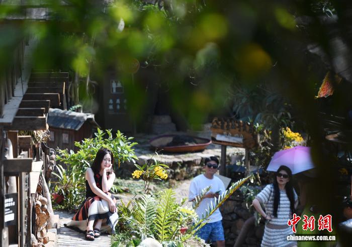 4月14日,游客在景迈山翁基古寨游玩。近日,地处中缅边境云南省普洱市澜沧拉祜族自治县的景迈山千年万亩古茶园进入采收季,吸引游人前来买茶、观光。2023年9月17日,“普洱景迈山古茶林文化景观”成为全球首个茶主题世界文化遗产。中新社记者 黄兴鸿 摄