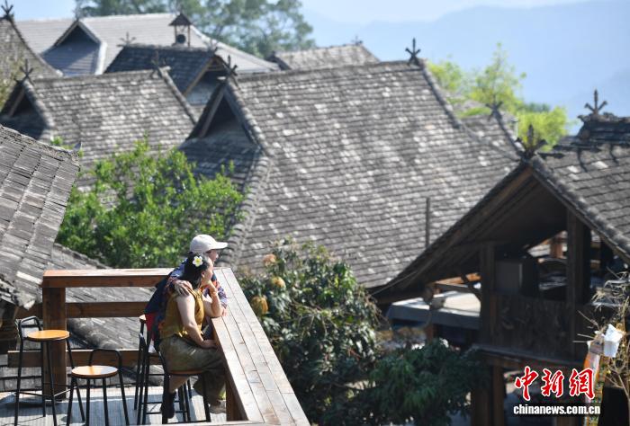 4月14日,两名游客在景迈山翁基古寨赏景。近日,地处中缅边境云南省普洱市澜沧拉祜族自治县的景迈山千年万亩古茶园进入采收季,吸引游人前来买茶、观光。2023年9月17日,“普洱景迈山古茶林文化景观”成为全球首个茶主题世界文化遗产。中新社记者 黄兴鸿 摄