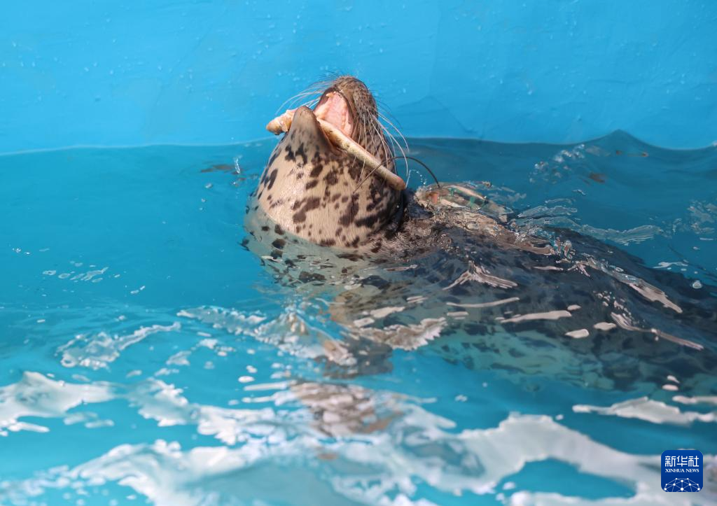 4月15日,辽宁省农业科学院所属辽宁省海洋水产科学研究院的一处水池中,一头待放归的斑海豹在水中游动,它的背部粘贴着用于监测和追踪的信标。