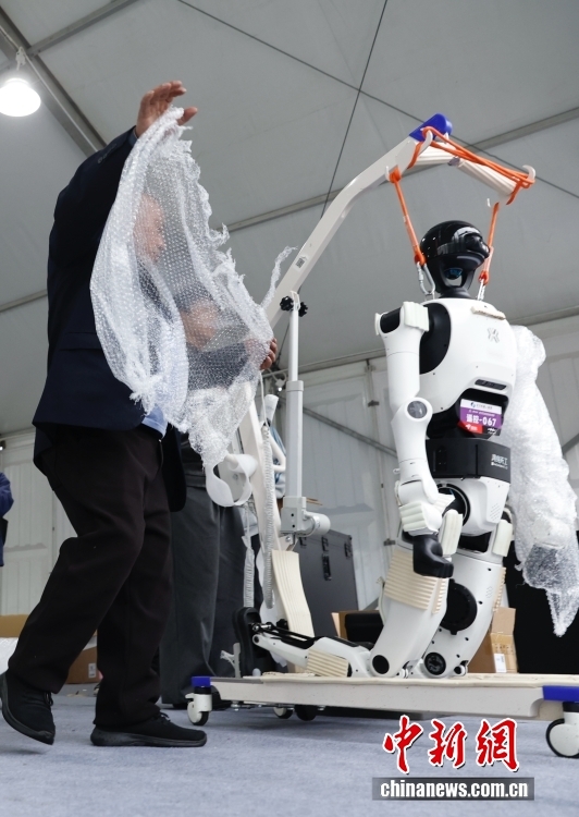 4月16日,工作人员展示参赛机器人脚部。据悉,2026北京亦庄半程马拉松暨人形机器人半程马拉松将于4月19日鸣枪开跑。300多台机器人、上百支队伍将同场竞技,参赛队伍涵盖企业、高校及训练营。