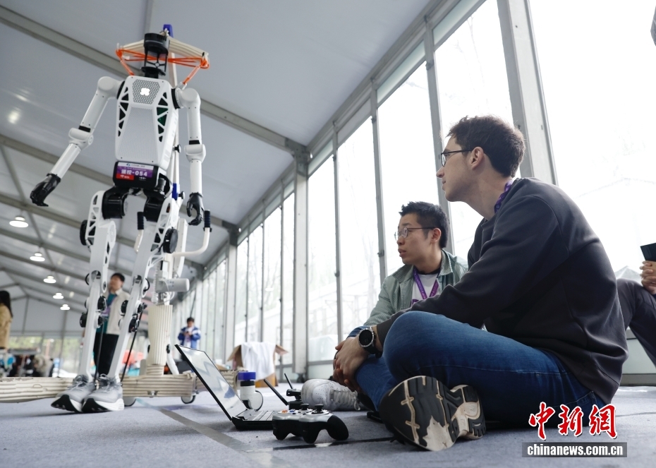 4月16日,工作人员在机器人大本营工作。据悉,2026北京亦庄半程马拉松暨人形机器人半程马拉松将于4月19日鸣枪开跑。300多台机器人、上百支队伍将同场竞技,参赛队伍涵盖企业、高校及训练营。