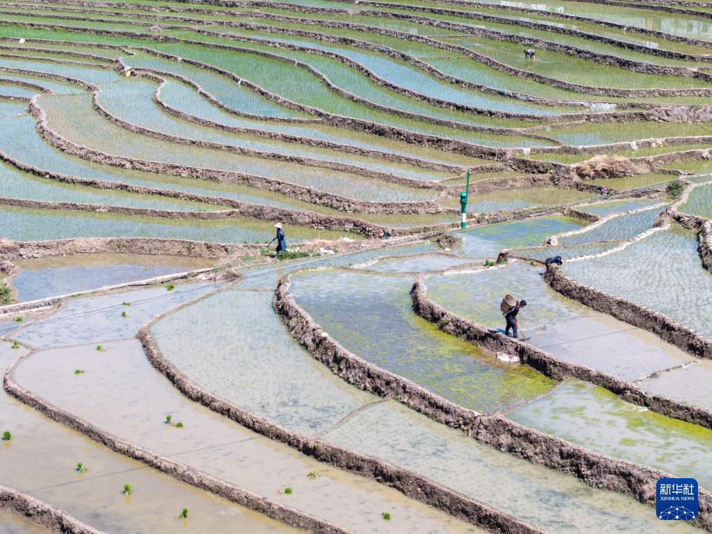 目前,四川省凉山彝族自治州甘洛县普昌梯田进入农忙时节。村民们在如镜映天的田里忙着插秧、劳作。