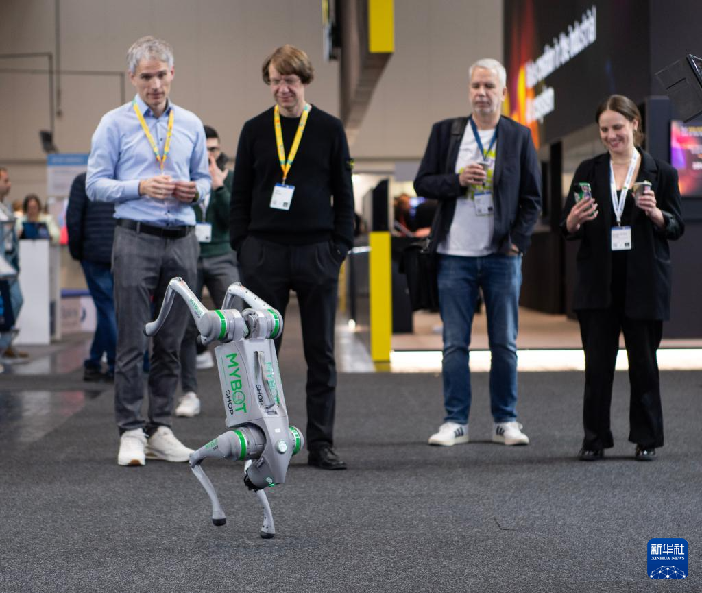 4月20日,人们在德国汉诺威工业博览会观看机械狗表演。