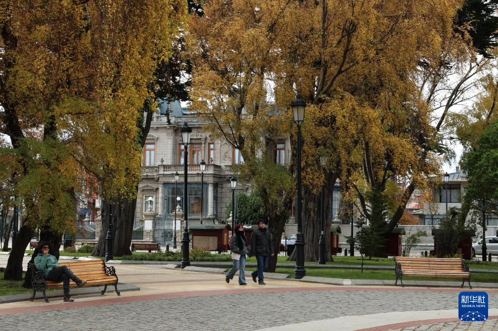 4月19日,人们走在智利南部蓬塔阿雷纳斯的武器广场上。