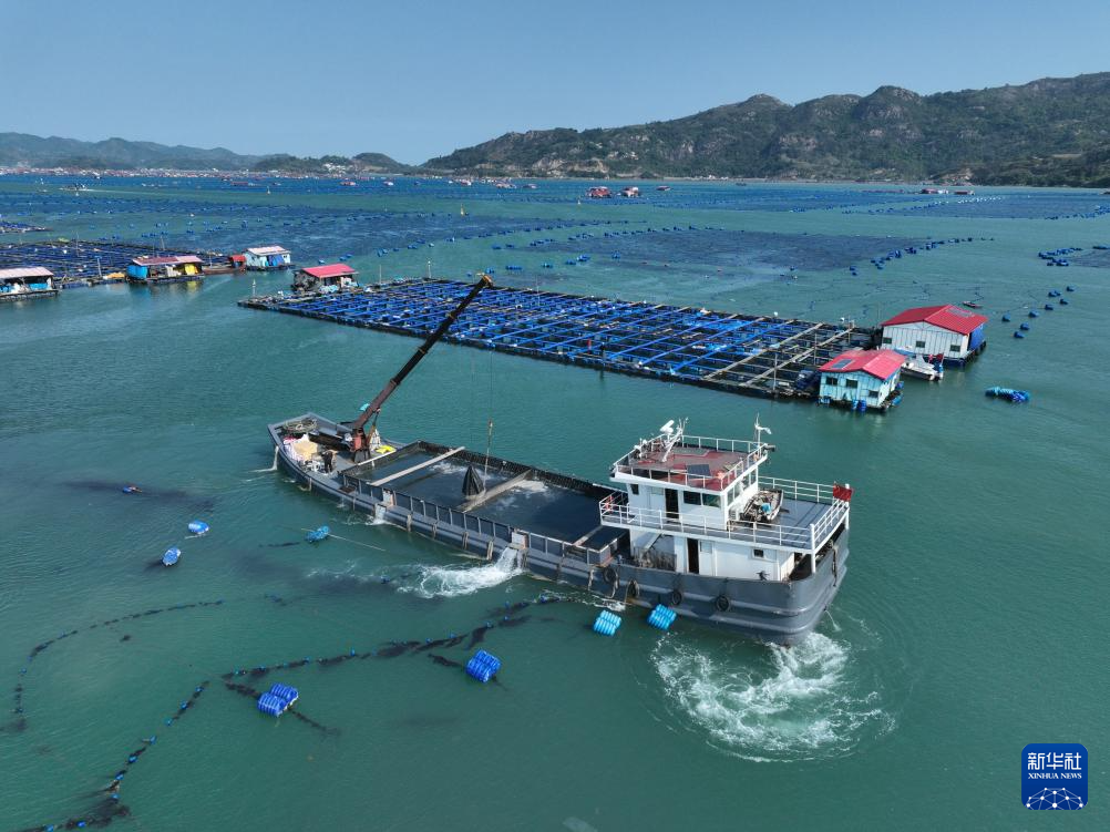 4月25日,一艘装载240万尾大黄鱼鱼苗的活水船,抵达福建省宁德市霞浦县下浒镇海上养殖区(无人机照片)。