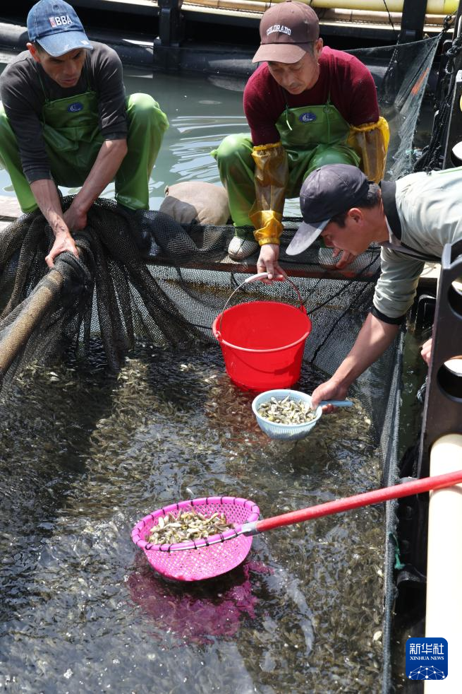 4月25日,在福建省宁德市三都澳海上养殖区,工人从育苗企业的养殖渔排收集大黄鱼鱼苗,准备通过活水船运往养殖户的渔排。