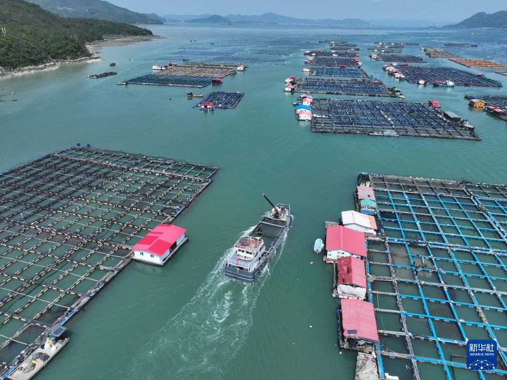 4月25日,一艘装载240万尾大黄鱼鱼苗的活水船,从福建省宁德市三都澳海域出发,驶向霞浦县下浒镇海上养殖区(无人机照片)。