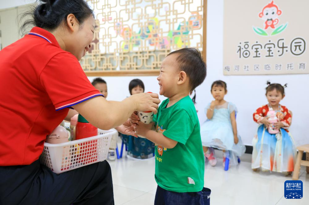 4月17日,在深圳市福田区梅林街道梅河社区党群服务中心设立的临时托育点,老师为孩子们分发水杯。