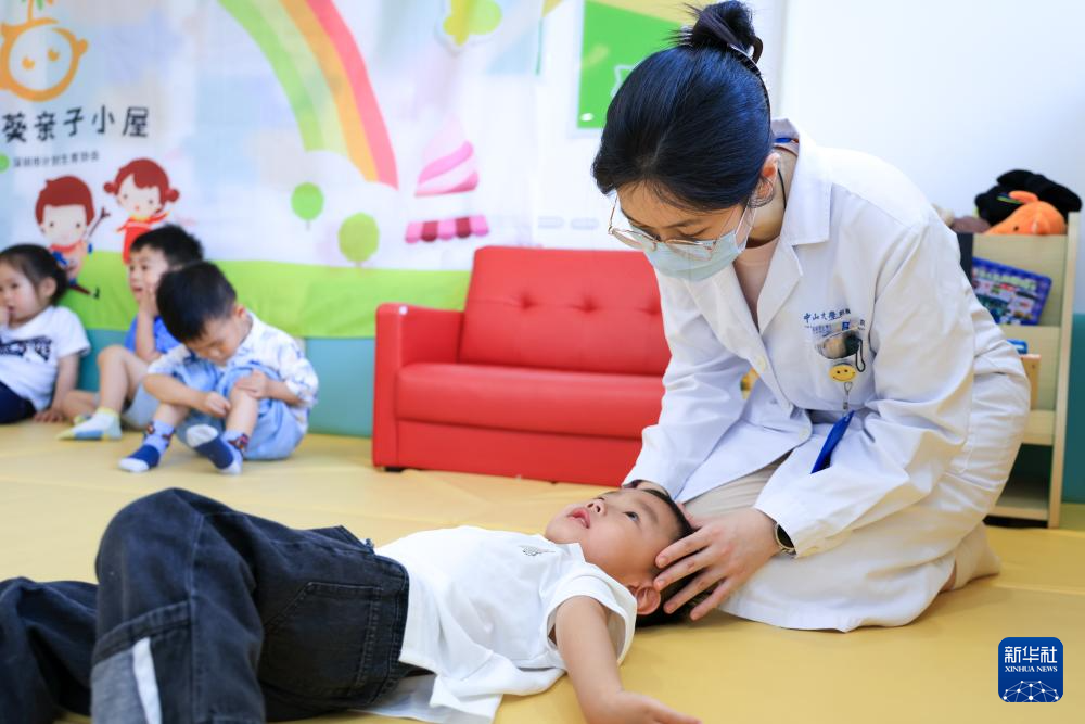 4月17日,在深圳市福田区华强北街道华红社区设立的托育点,华红社区健康服务中心的医生为托育点儿童进行推拿。