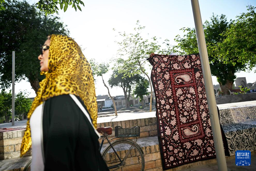 4月24日,在乌兹别克斯坦布哈拉古城,一名女子从在整理手工地毯的商贩(右)前经过。