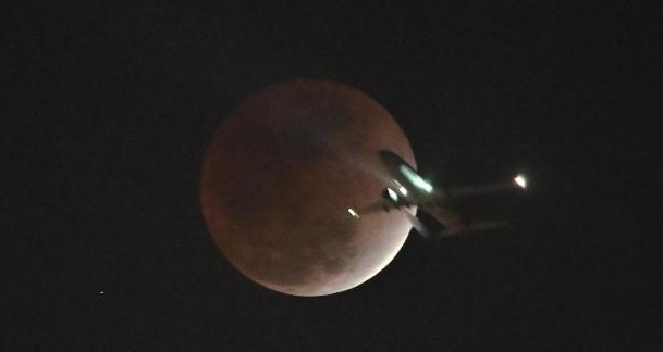 太原元宵夜邂逅月全食 飞机与红月生光同框