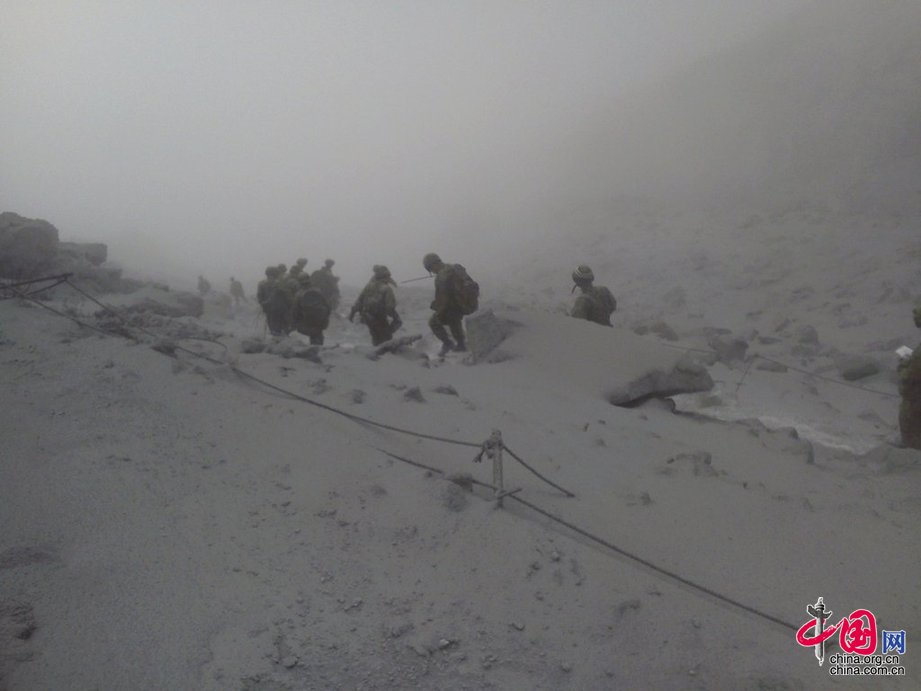 当地时间2014年10月2日,日本长野县和岐阜县交界处的御岳山火山喷发之后,日本自卫队士兵正在执行搜救任务。御岳山火山9月27日喷发已经导致47人死亡,另有16人下落不明。