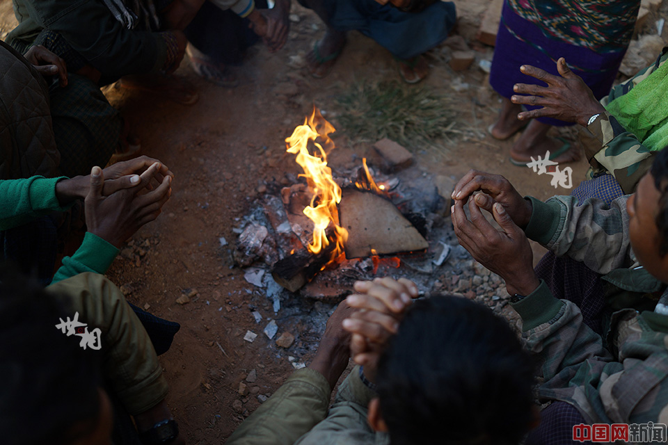在果敢125难民营外,早起的难民开始点起篝火取暖,睡在地上,两面灌风,尽管有被褥,丝丝寒气依然令人难熬。
