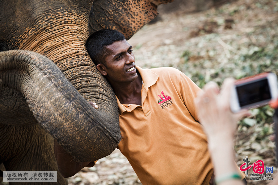 驯象人与自己照顾的大象在游人的镜头前合影。米杜 摄