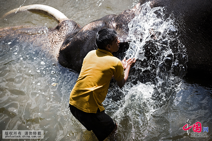 驯象人给大象洗澡。米杜 摄