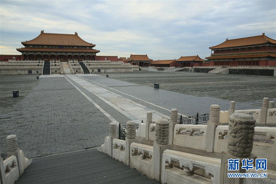 这是7月25日在故宫博物院太和殿前广场拍摄的照片。近日,近600岁的紫禁城因京城连日大雨成为关注焦点,特别是一组大暴雨时故宫博物院内地面未现明显积水的照片,令网友为故宫的排水系统点赞。对此,故宫博物院院长单霁翔25日在京表示,这不仅体现了古人建筑营造的智慧与匠心,也体现今人保护文化遗产的执著。新华社记者才扬 摄