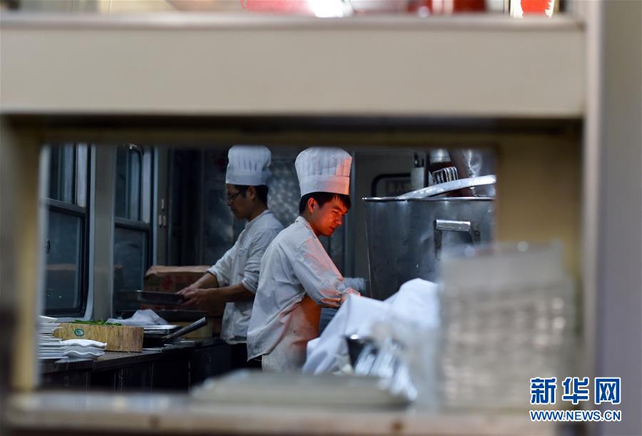 1月13日,K4186次外来务工人员专列餐车厨师姚季科(右)在为乘客准备饭菜。 1月13日下午1时58分,福建首趟外来务工人员专列K4186次列车由福州开往四川广安,2591名外来务工者开始了返乡旅程。这趟列车途经福建、江西、湖北、陕西、四川5省11站,全程2084公里,历时27小时35分钟。新华社记者随车全程感受了外来务工人员返乡的艰辛与温暖,乘务人员的坚守与付出。新华社记者姜克红 摄