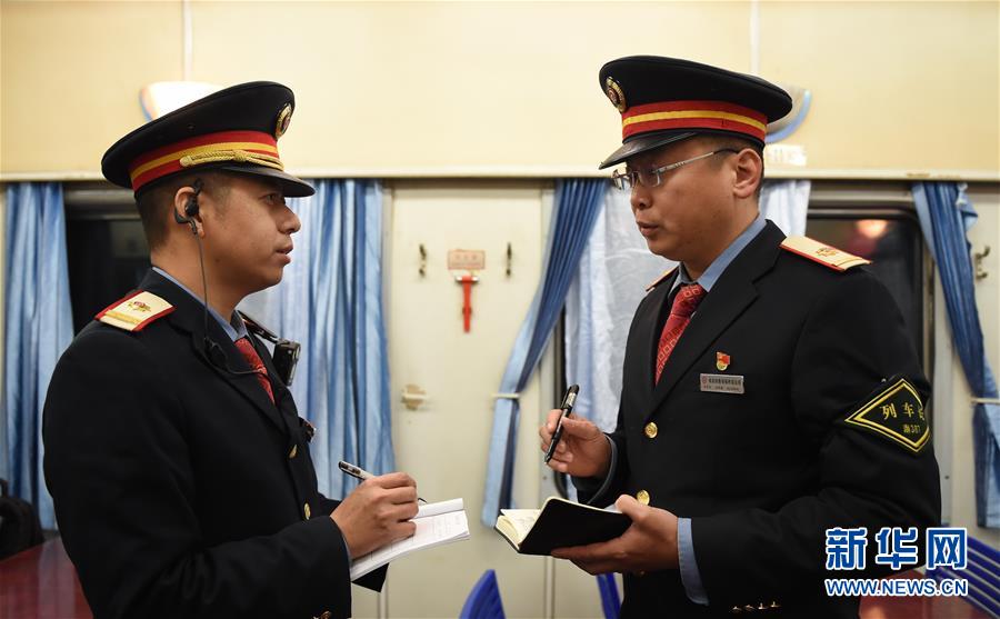1月14日凌晨,K4186次外来务工人员专列列车长缪小林(左)与宋洪斌进行夜间交接班。 1月13日下午1时58分,福建首趟外来务工人员专列K4186次列车由福州开往四川广安,2591名外来务工者开始了返乡旅程。这趟列车途经福建、江西、湖北、陕西、四川5省11站,全程2084公里,历时27小时35分钟。新华社记者随车全程感受了外来务工人员返乡的艰辛与温暖,乘务人员的坚守与付出。新华社记者林善传 摄