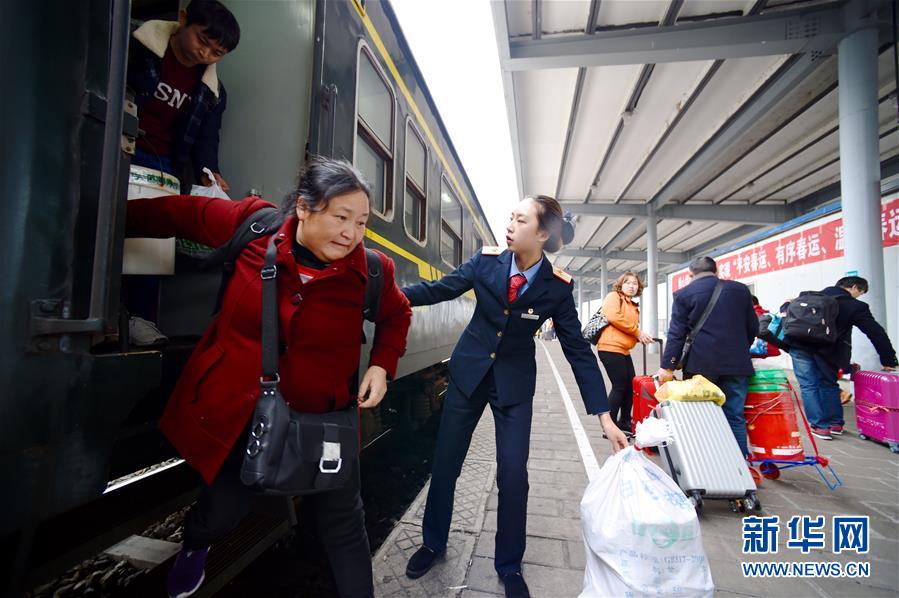 1月14日,K4186次外来务工人员专列乘务员黄慧欣在四川渠县火车站帮助乘客下车。 1月13日下午1时58分,福建首趟外来务工人员专列K4186次列车由福州开往四川广安,2591名外来务工者开始了返乡旅程。这趟列车途经福建、江西、湖北、陕西、四川5省11站,全程2084公里,历时27小时35分钟。新华社记者随车全程感受了外来务工人员返乡的艰辛与温暖,乘务人员的坚守与付出。新华社记者姜克红 摄