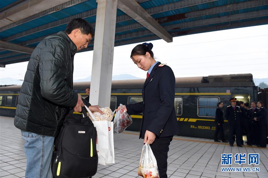 1月14日,K4186次外来务工人员专列抵达四川广安站后,乘务员付于芳在站台见到前来看望的父亲付顺春。 1月13日下午1时58分,福建首趟外来务工人员专列K4186次列车由福州开往四川广安,2591名外来务工者开始了返乡旅程。这趟列车途经福建、江西、湖北、陕西、四川5省11站,全程2084公里,历时27小时35分钟。新华社记者随车全程感受了外来务工人员返乡的艰辛与温暖,乘务人员的坚守与付出。新华社记者姜克红 摄