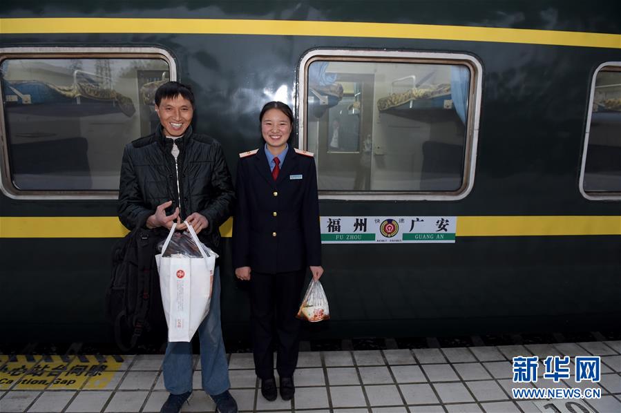 1月14日,K4186次外来务工人员专列抵达四川广安站后,乘务员付于芳在站台见到前来看望的父亲付顺春,父女俩在列车前合影。 1月13日下午1时58分,福建首趟外来务工人员专列K4186次列车由福州开往四川广安,2591名外来务工者开始了返乡旅程。这趟列车途经福建、江西、湖北、陕西、四川5省11站,全程2084公里,历时27小时35分钟。新华社记者随车全程感受了外来务工人员返乡的艰辛与温暖,乘务人员的坚守与付出。新华社记者姜克红 摄