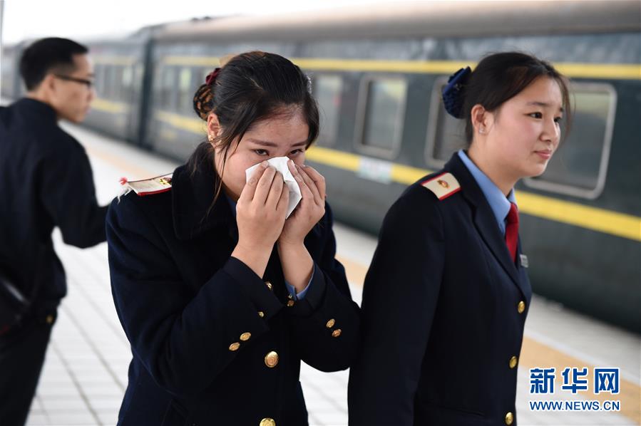 1月14日,K4186次外来务工人员专列抵达四川广安站后,乘务员周艳(前左)得知家人带着她1岁多的女儿在车站外等候,激动落泪。她们只有半个小时的团聚时间,随后列车将返程。 1月13日下午1时58分,福建首趟外来务工人员专列K4186次列车由福州开往四川广安,2591名外来务工者开始了返乡旅程。这趟列车途经福建、江西、湖北、陕西、四川5省11站,全程2084公里,历时27小时35分钟。新华社记者随车全程感受了外来务工人员返乡的艰辛与温暖,乘务人员的坚守与付出。新华社记者姜克红 摄