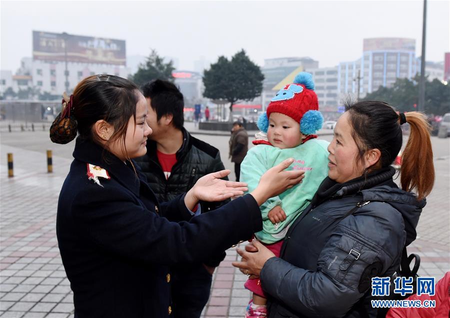 1月14日,K4186次外来务工人员专列抵达四川广安站后,乘务员周艳(前左)在车站外将1岁多的女儿从婆婆的怀中接过。她们只有半个小时的团聚时间,随后列车将返程。 1月13日下午1时58分,福建首趟外来务工人员专列K4186次列车由福州开往四川广安,2591名外来务工者开始了返乡旅程。这趟列车途经福建、江西、湖北、陕西、四川5省11站,全程2084公里,历时27小时35分钟。新华社记者随车全程感受了外来务工人员返乡的艰辛与温暖,乘务人员的坚守与付出。新华社记者姜克红 摄