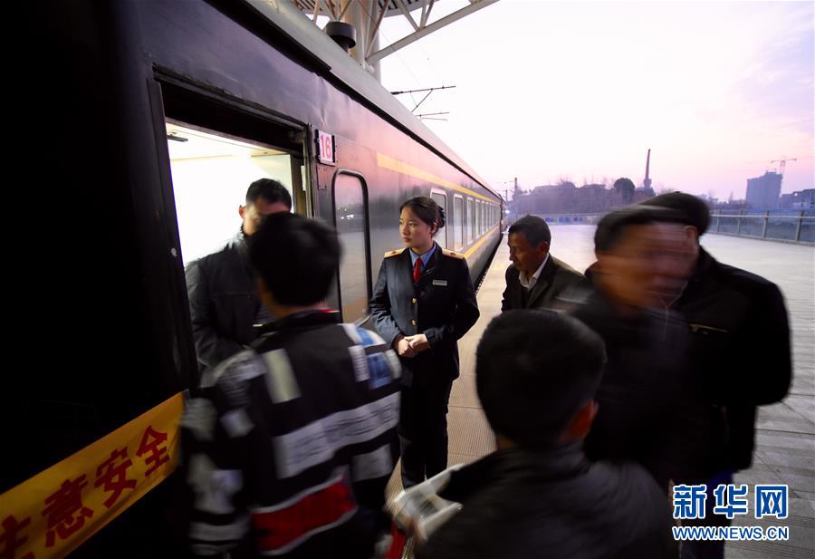 1月14日清晨,K4186次外来务工人员专列乘务员付于芳在湖北襄阳东站迎送旅客。 1月13日下午1时58分,福建首趟外来务工人员专列K4186次列车由福州开往四川广安,2591名外来务工者开始了返乡旅程。这趟列车途经福建、江西、湖北、陕西、四川5省11站,全程2084公里,历时27小时35分钟。新华社记者随车全程感受了外来务工人员返乡的艰辛与温暖,乘务人员的坚守与付出。新华社记者姜克红 摄