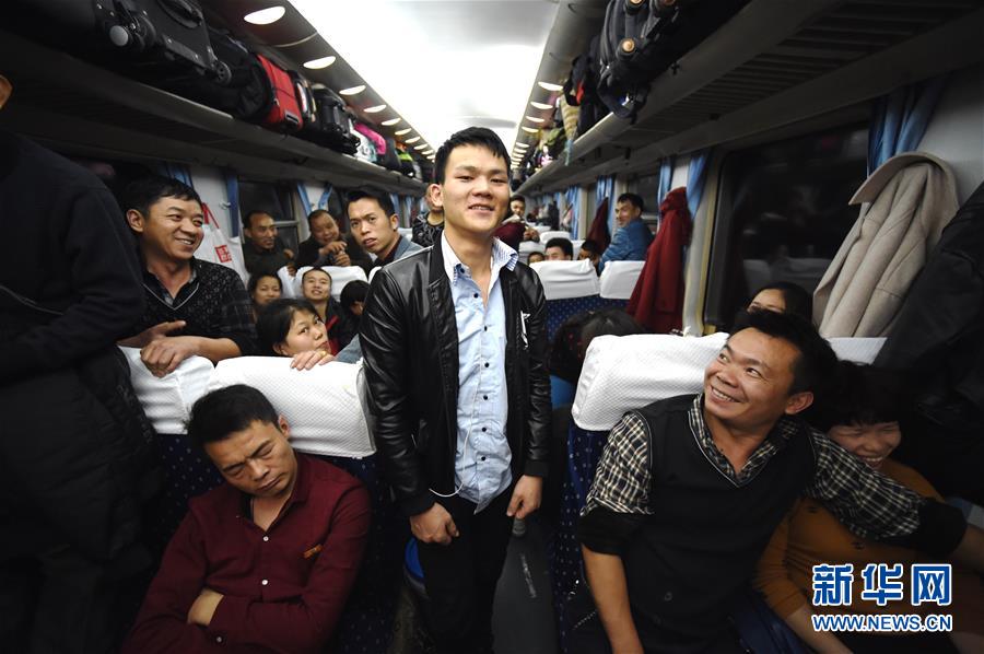 1月13日晚,K4186次外来务工人员专列内,来自四川渠县的小伙李国(中)看到记者拍摄,自信地面对镜头。 1月13日下午1时58分,福建首趟外来务工人员专列K4186次列车由福州开往四川广安,2591名外来务工者开始了返乡旅程。这趟列车途经福建、江西、湖北、陕西、四川5省11站,全程2084公里,历时27小时35分钟。新华社记者随车全程感受了外来务工人员返乡的艰辛与温暖,乘务人员的坚守与付出。新华社记者姜克红 摄