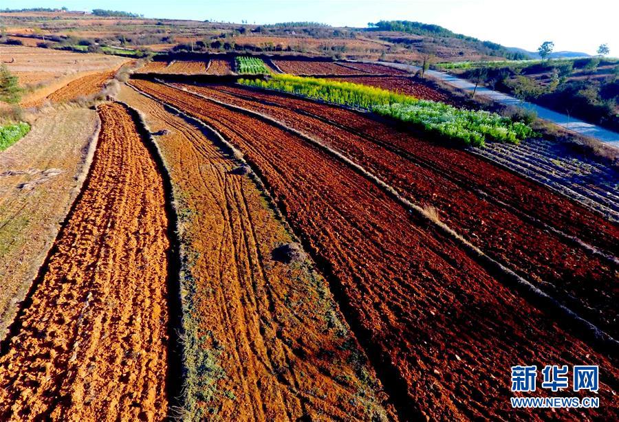 云南马龙县大庄乡石河村的红土地和农作物(2月4日摄)。俯瞰秀美的云南省曲靖市马龙县山乡,一栋栋农民新居拔地而起,即将播种的红土地线条流畅,明媚的春光下长势喜人的各种农作物和绿色生态植被,构成美丽的新农村诗画。新华社记者杨宗友摄