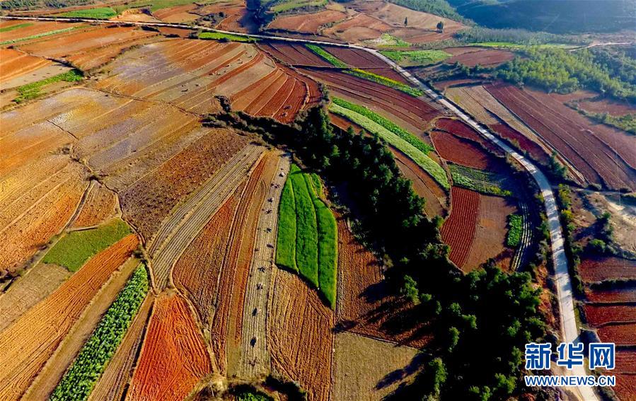 穿越云南马龙县大庄乡肥沃土地的乡村公路(2月4日摄)。俯瞰秀美的云南省曲靖市马龙县山乡,一栋栋农民新居拔地而起,即将播种的红土地线条流畅,明媚的春光下长势喜人的各种农作物和绿色生态植被,构成美丽的新农村诗画。新华社记者杨宗友摄