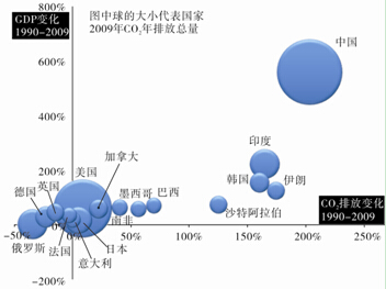 1 世界主要国家GDP和二氧化碳排放变化(1990~2009年)(数据来源:2010年世界银行和BP公司数据)