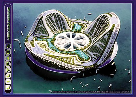 法国著名建筑设计师文森特·卡勒波特设计了一艘匪夷所思的“未来版诺亚方舟”Lilypad,犹如一朵巨大的百合花盛开在海面上,可供5万人同时居住。