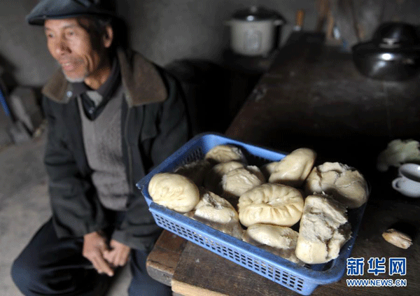 1月20日,距离县城5公里的甘肃陇南市徽县水阳乡牟坝村村民王义忠坐自家厨房里,旁边篮子里的面食是他一个星期的口粮。“好几年了,我从来没下过馆子,一年中有肉的饭不超过10顿。”今年64岁的王义忠说,他家只有三分菜地,包括农村养老保险、低保在内,他和老伴每月只有200元左右的收入。新华社记者聂建江 摄
